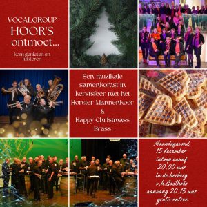 Op maandag 15 december geeft Vocalgroup Hoor`s oder titel van “Vocalgroup Hoor`s ontmoet..” een concert in de Herberg van het Gasthoês vanaf 20:15. Gasten bij dit optreden zijn “Happy Christmas Brass” en het Horster Mannenkoor.